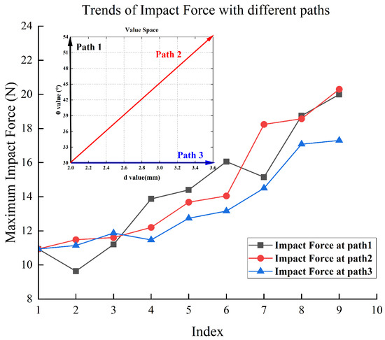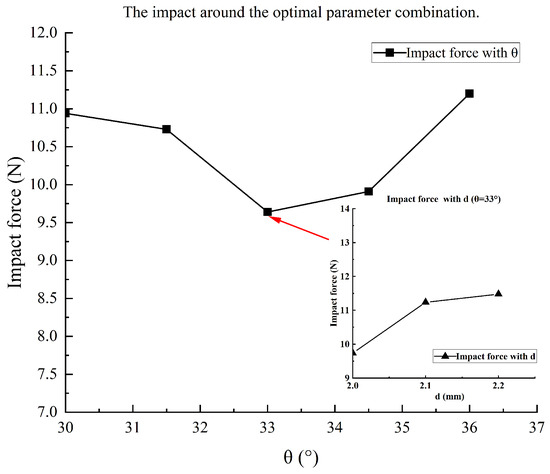 The analysis of simulation results at the optimal point and the adjacent sample point indicates that, when d is kept constant, the maximum impact force reaches a minimum at . Any deviation from this angle, whether an increase or a decrease, results in higher impact forces. Similarly, when is fixed and d increases, the resulting impact forces exceed those obtained at mm. These results confirm that the combination represents the optimal solution within the defined parameter space.