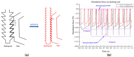 Figure 15 presents the structural configurations and simulation results of the ratchet teeth on both the pawl and docking rod before and after optimization. Before optimization, eight impact events were observed, with a maximum impact force of 14.05 N. Under the combination of the optimized parameters, the number of impact events increased to thirteen, while the peak impact force decreased to 9.64 N, representing a 31.39% reduction in the maximum impact force on the docking rod.