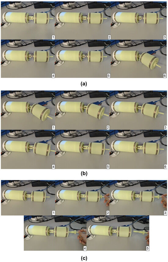 Figure 17a demonstrates the relaxation process of the joint DOFs. The restriction state of the DOFs is shown in a(1), where the relative position of the two modules cannot be changed, followed by the sleeve retraction process in a(2–5). Finally, as shown in a(6), the sleeve reaches the preset position and the DOFs of the joint are unlocked.
