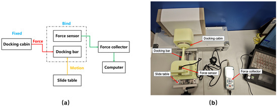 The measurement principle and experimental setup used to assess the impact force on the docking rod are illustrated in Figure 18. The docking module is securely mounted on a fixed platform. The docking rod is installed within a structural fixture positioned above a sliding table and placed in close contact with a force sensor. During the docking process, the sliding table is driven forward to simulate the motion of the docking rod. The force sensor captures the resulting impact forces on the docking rod, which are processed by a data acquisition system and transmitted to a computer for recording and analysis.