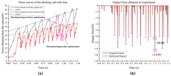 The experimental results are presented in Figure 19. Data analysis reveals a significant reduction in the maximum impact force after optimization of the ratchet tooth parameters. Specifically, the maximum impact force decreased from 14.4 N to 10.5 N, corresponding to a reduction of approximately 27.08%. Although this is lower than the reduction of 31.39% predicted by the simulation, it still represents a substantial improvement. In addition, the force needed during the docking process also showed a large decrease, as obtained from the trend line.
