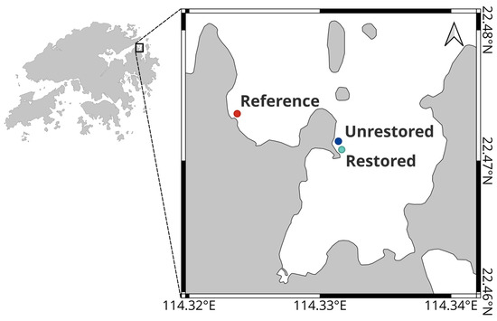 Locations of study sites in Hoi Ha Wan Marine Park, Hong Kong. Map showing the positions of the reference (Gruff Head), restored (Coral Beach), and unrestored (Coral Beach) sites surveyed in this study. Greyscale shading delineates the land boundary of Hong Kong. Basemap data were obtained from the Lands Department (Digital Topographic Map iB5000) and the DIVA-GIS database.