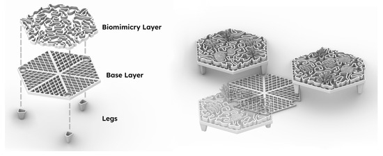 The 3D-printed ceramic reef tiles used in this study were custom-engineered ceramic substrates designed to promote coral recruitment, enhance structural complexity, and mitigate sediment accumulation in a subtropical marine environment. Each tile was hexagonal in shape, with a maximum width of 650 mm, and comprised two integrated functional layers: a structural base layer (“grid layer”) and a biomimetic surface layer (“coral layer”) (Figure 2). The grid layer featured a diagrid framework with integrated lateral bracing to maximize mechanical stability while minimizing material usage and fabrication defects. The geometry was optimized to reduce cracking during drying and thermal stress during firing, with a print path totaling approximately 170 m in length. This design facilitated uniform moisture evaporation and enhanced compressive strength under load. To improve hydrodynamic performance and minimize sediment deposition, a three-legged footing system was printed on the underside of each tile after drying (Figure 2). These legs elevated the tile slightly above the seabed to promote water flow and create a sheltered interface for benthic recruitment.
