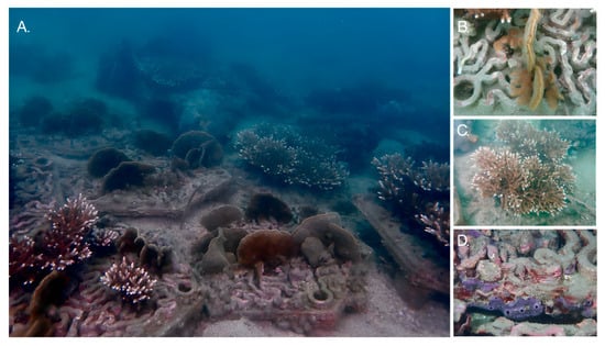 - Perkol-Finkel, S.; Benayahu, Y. Recruitment of Benthic Organisms onto a Planned Artificial Reef: Shifts in Community Structure One Decade Post-Deployment. Mar. Environ. Res. 2005, 59, 79–99. [Google Scholar] [CrossRef]
