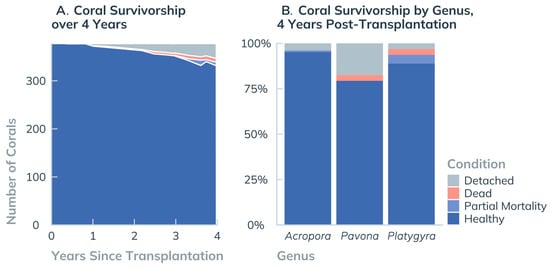 Summary of coral survivorship and condition. (A) Overall survivorship of corals, and (B) genus-specific survivorship of Acropora, Pavona, and Platygyra over a four-year period following transplantation. Coral conditions were categorized as Healthy (blue), Partial Mortality (light blue), Dead (red), and Detached (grey).