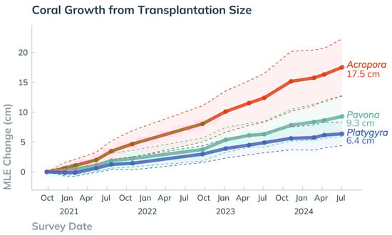 Coral Growth from transplantation size. Change in maximum linear extension (MLE, cm) of the three genera of corals, Acropora (red), Pavona (green), and Platygyra (blue) over a 4-year period following transplantation. The solid line represents the mean values; the dotted lines indicate standard deviation.