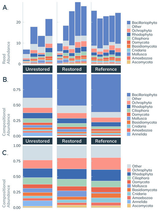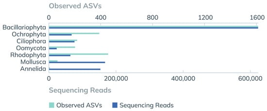 Of the five phyla with the highest sampled ASV richness, four were Chromista: Bacillariophyta (1613 ASVs; 623,144 reads), Ochrophyta (389 ASVs; 67,893 reads), Ciliophora (218 ASVs; 76,469 reads), and Oomycota (202 ASVs; 23,437 reads; Figure 7). Rhodophyta, however, had the second-greatest assigned ASV richness of any phyla (457 ASVs; 64,298 reads), accounting for the majority (84%) of ASVs assigned to the kingdom Plantae (Figure 7). Among metazoans, Cnidaria had the greatest ASV richness (174 ASVs; 10,920 reads), followed by Mollusca (67 ASVs; 167,474 reads), Porifera (46 ASVs; 3016 reads), Platyhelminthes (32 ASVs; 7184 reads), and Arthropoda (26 ASVs; 35,279 reads; Figure A2). In terms of raw sequencing reads, Annelida was the third most abundant phylum among all kingdoms while being represented by low ASV diversity (8 ASVs; 153,520 reads; Figure 7).