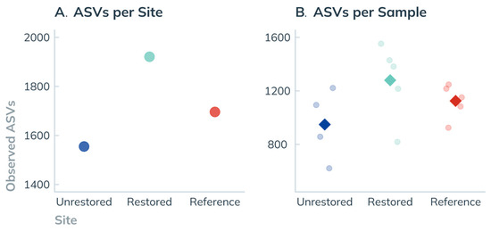 Point plots of observed ASV richness by site and per sample. Based on the parameters of the prevalence filter applied to the community metabarcoding dataset, all ASVs represented in this plot appeared in a minimum of three samples per site. (A) The number of unique ASVs observed across all samples from the unrestored (1555 ASVs, n = 4), restored (1921 ASVs, n = 5), and reference (1696 ASVs, n = 5) sites. Each ASV was counted once per site, regardless of how many replicates it was detected in. (B) The number of ASVs detected per sample is indicated by the circular points. Diamonds indicate mean ASV richness (±SD) across all replicates for each site: unrestored (946 ± 266 ASVs per sample, n = 4), restored (1280 ± 284, n = 5), and reference (1125 ± 129, n = 5).
