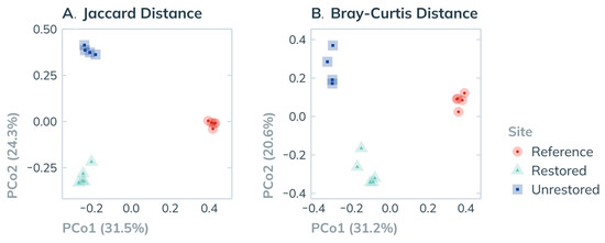 Two sets of Principal Coordinate Analyses (PCoA) were conducted to assess differences in community composition between sites. Each site was shown to have a distinct community structure, with both ordinations producing tight, largely non-overlapping clusters (Figure 9). The Jaccard distance ordination (presence/absence) showed some overlap between the unrestored and restored sites along the first principal coordinate (PCo1, 31.5%). However, all three sites occupied distinct positions along the second principal coordinate (PCo2, 24.3%; Figure 9A). PERMANOVA analysis of the Jaccard dissimilarity matrix confirmed significant differences in assemblages between the sites (F(2,11) = 6.9, p < 0.001, permutations = 999; Table 7). Post-hoc pairwise testing indicated significant differences between all site pairs (Restored vs. Reference: F(1,8) = 7.91, p = 0.01; Restored vs. Unrestored: F(1,7) = 5.73, p < 0.01; Reference vs. Unrestored: F(1,7) = 6.92, p < 0.01; Table 8).