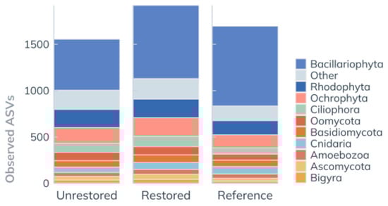 ASV richness was evaluated in terms of both the overall site richness and the average number of ASVs observed per sample (Figure 8). The restored site exhibited the highest overall richness, with 1921 observed ASVs—13.3% more ASVs than the number detected at the reference coral community (1696 ASVs) and 23.5% more than the sampled richness of the unrestored seabed (1555 ASVs). When Bacillariophyta ASVs were excluded—given the impact the disproportionately high diversity of this phylum may have on observed patterns of overall site richness—the restored site still displayed the highest number of observed ASVs (1129). In contrast, a greater number of non-Bacillariophyta ASVs were observed at the unrestored site (1003) than at the reference site (833). Non-Bacillariophyta richness at the restored site was therefore 12.5% higher than that of the unrestored site and about 35.6% higher than that of the reference site.