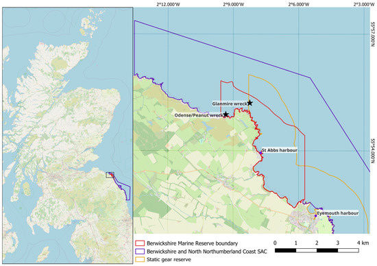 The BMR is located between St Abbs and Eyemouth off the east coast of Berwickshire, Scotland, UK (Figure 1). It encompasses 8 km of coastline and extends out to the 50 m depth contour, covering an area of 10.3 km2. It was set-up to protect local habitats and species, and promote responsible recreational use (divers, anglers, boaters, etc.) alongside an active fishery (www.berwickshiremarinereserve.org.uk [accessed on 21 August 2025]).