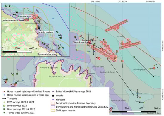 Automatic Identification System (AIS) based trawling fishing vessel tracks from MarineTraffic (www.marinetraffic.com [accessed on 25 March 2025]) during the 2019 incursion in the Static Gear Reserve (SGR) off the Berwickshire coast, UK, overlaid on horse mussel (Modiolus modiolus) sightings and survey locations.