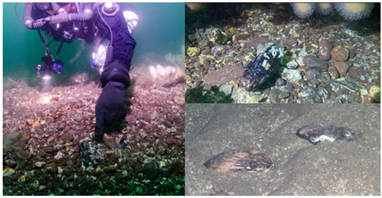 Horse mussels are found on a variety of substrata, most often on muddy gravel through to cobbles and bedrock [3,6,33]. Using Seasearch seabed types, during this study horse mussels were seen on cobbles and pebbles, mixed ground, and sand and gravel. A high-resolution geophysical and ground truth sampling survey conducted in 2018 and 2019 provided a detailed benthic habitat map for Berwickshire. Seafloor conditions ranged between coarse sands and gravel, rocky reefs, cobbles and boulders, medium coarse sands and ripples and fine to medium sands [34]. The looser substrata may improve recruitment, as inaccessible byssus threads of adult horse mussels in sediment may provide larvae protection from predation [27].