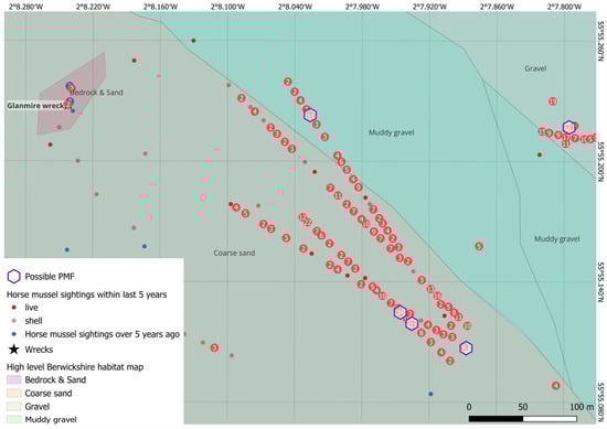Where possible, horse mussel sightings were plotted along transects using QGIS Desktop 3.42.2 [20]. Sightings from historical records, habitat type, survey locations, and shipwreck locations were also mapped.