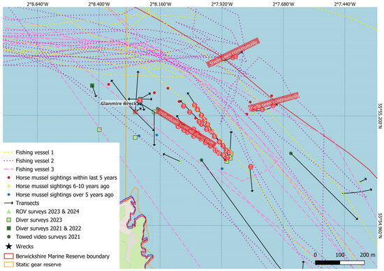 Automatic Identification System (AIS) data from Global Fishing Watch (GWF, https://globalfishingwatch.org/ [accessed on 25 March 2025]) and MarineTraffic (www.marinetraffic.com [accessed on 25 March 2025]) has been explored in order to gain some understanding of possible fishing effort in the BMR. Evidence of vessel effort tracks were recorded during the 2019 incursion into the SGR (Figure 5). This suggested the vessels may have actively avoided the Glanmire wreck, likely avoiding the increased risk of gear entanglement. This avoided area happened to be where the majority of this study’s survey effort and sightings occurred. Future studies could look to survey in more northly locations to examine the possible difference of horse mussels in untrawled and trawled areas within the SGR.