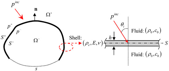 Consider a thin shell submerged in an infinite acoustic medium with a speed of sound and mean density , as shown in Figure 1. The shell is made of an elastic material characterized by a mass density , Young’s modulus , and Poisson’s ratio , and has a thickness . The neutral surface of the thin shell is denoted by , and an imaginary surface is constructed to divide the acoustic domain. The shell divides two subdomains, denoted by the exterior subdomain , bounded by the outer boundary , and the interior subdomain , bounded by the inner boundary . is the normal vector pointing in the direction of . The shell is exposed to an incident wave pressure in a scattering problem. The surface pressure on the is denoted by , and that on the is denoted by . By applying the Helmholtz integral equation to each subdomain, the thin-shell integral equation [32] can be derived and expressed in the following form