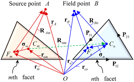 (2) is the position vector from to an arbitrary point on the th facet’s surface , is the position vector from to a centroid on , and ;