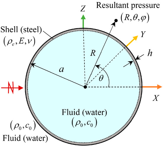 This section focuses on the canonical problem of acoustic scattering from a water-filled spherical shell immersed in an infinite fluid domain. The shell is composed of stainless steel, with all geometric and material parameters provided in Table 1. Figure 3 illustrates a harmonic acoustic plane wave of angular frequency incident onto the spherical shell along the positive -direction. The resultant pressure in the external fluid domain, denoted as , is expressed as the superposition of the incident pressure, labeled as , and the scattered pressure, referred to as , represented through a series of normal modes [5,6].