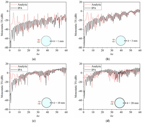 Comparison of monostatic TS derived from IPA concerning analytical solution for a water-filled spherical shell scattering with (a) mm, (b) 3 mm, (c) 10 mm, and (d) 20 mm.