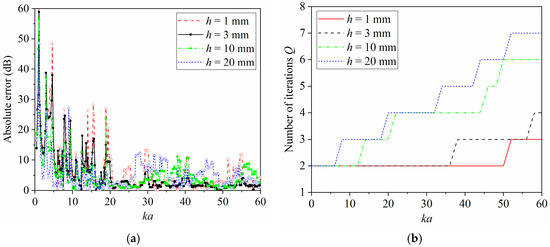 where denotes the monostatic TS configuration. The IPA-based TS is computed via Equations (24)–(27) and (35), while the analytical TS is obtained through the normal mode expansion in Equations (33) and (34) combined with Equation (35). A comparison of monostatic TS between IPA results and analytical solutions is conducted across varying Helmholtz numbers and shell thicknesses . Results for , 3, 10 and 20 mm are, respectively, presented in Figure 4a–d. As theoretically anticipated, the prediction accuracy of TS increases with . At elevated regimes, the predicted TS closely matches analytical solutions, while in the low- domain, accuracy progressively decreases. Crucially, reduced thickness-to-radius ratio () excites higher-density elastic resonance spectra, yet the characteristic interference patterns remain accurately predicted. Maximum discrepancies emerge in the low-, low- regime, attributable to unmodeled elastic-wave coupling mechanisms. The IPA solutions reproduce the general behavior of the analytical solutions, including the interference of multiple reflected and transmitted wave components, phenomena notably absent in both rigid and pressure-release boundary approximations. This discrepancy becomes particularly evident when examining the absolute error between analytical and IPA-based TS for varying and , as shown in Figure 5a. Since IPA neglects elastic-wave contributions, absolute errors exceeding 20 dB occur at low- resonance peaks. At high , rapid interference oscillations combine with minor miscalculations in acoustic wave phase accumulation through the shell, generating substantial absolute errors (>8 dB) at interference extrema positions. The number of iterations required for IPA convergence for varying for , 3, 10, and 20 mm, as shown in Figure 5b. The corresponds to the order of physical interaction, which depends on target geometry complexity and increases with both and . For complex geometries, a priori determination of is challenging; however, results demonstrate that remains bounded, reaching a maximum of 7 iterations at convergence threshold and . This rapid convergence validates the IPA method’s efficiency, attributable to the initial Kirchhoff approximation closely approximating the final solution.