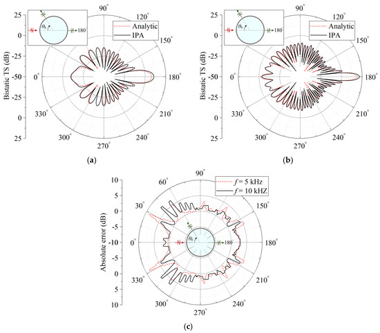 Comparison of bistatic TS of a water-filled spherical shell with mm between IPA results and analytical solutions at (a) 5 kHz and (b) 10 kHz. (c) Absolute error in dB computed as the value of over bistatic angles.