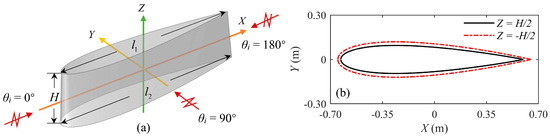 (a) Scattering by a scaled sail model under plane wave incidence at azimuth angle in the plane, (b) featuring symmetrical airfoil profiles on both upper and lower boundaries defined by Equation (19).