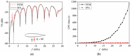 To compare the accuracy and computational efficiency between the FEM and IPA for general thin-shell structures, the sail model in Figure 8 is analyzed. The FEM simulation is implemented using the Acoustic–Solid Interaction, Frequency-Domain multiphysics module within COMSOL Multiphysics 6.2 commercial software [35]. Variations in the monostatic TS against frequency at the incident azimuth angle of are illustrated in Figure 9a. The error between the IPA result and the FEM result decreases with increasing frequency. The resonance peaks existing on the FEM curves do not change the overall tendency of the variation. At high frequencies, the TS predicted by the IPA is very close to the FEM. At lower frequencies, the accuracy decreases but the trend remains physically consistent. The corresponding CPU time used for computing TS in the FEM and IPA is given in Figure 9b. It is clear from the plot that the IPA can greatly shorten the computation time compared with the time spent by FEM, with particularly substantial efficiency gains observed at higher frequencies. One should be noted that the FEM exhibits substantial memory requirements, with the computational capacity being constrained for solving higher-frequency problems.