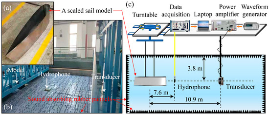 To verify the effectiveness of the proposed IPA method and demonstrate scattering characteristics of a thin-shell target, we perform an acoustic scattering experiment on the scaled sail model immersed in an anechoic tank of 30 m 15 m 10 m. To simulate an approximate free-field environment within the tank while ensuring noise isolation, the interiors are lined with sound-absorbing rubber panels designed for optimal sound absorption. As shown in Figure 10a, the experimental stainless-steel model is constructed with the same geometric dimensions and acoustic parameters as those used in the numerical simulation. Figure 10b,c shows the experimental setup. The experimental model spins around its axis at in sequence and is controlled by a mechanical turntable, whereas the transducer and receiver are fixed. The transducer has a frequency range of 60–120 kHz with an average transmitting voltage response of 146 dB re re 1 m. The receiver is a piezoelectric hydrophone (Type 8103, Brüel & Kjaer, Nairom, Denmark) operating over a frequency range of 0.1 Hz–180 kHz with a receiving sensitivity of −211 dB re . An uninterrupted power supply powers the entire measurement system to remove AC interference.