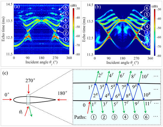 The transmitted signal is a linear frequency-modulated chirp spanning from 60 kHz to 80 kHz, with a pulse width of 0.2 ms and a burst interval of 500 ms to ensure steady-state measurement conditions. A matched filter is implemented to enhance signal-to-noise ratio and time-delay resolution. Figure 11a,b compares the time-angle spectra of matched filtered echoes obtained from the scanned measurement and IPA simulation, showing close agreement. The results in these figures are derived through mirror symmetry of the data based on the geometric symmetry of the sail model, and subsequent analyses focus exclusively on the domain. Both clearly exhibit primary reflections centered at 12.6 ms (outer surface signature) and higher-order reflections and transmissions beyond 12.8 ms across incidences, though experimental features were less distinct due to noise. Minor inconsistencies in echo envelope morphology suggest possible misalignment between the transducer, receiver, and model centroid. As depicted in Figure 11c, the incident wave illuminates the thin shell structure, generating reflected (superscript ) and transmitted (superscript ) wave components. The primary reflected wave () propagates away from the lower surface, while the field transmitted into the interior fluid along the upward propagation direction () is reflected onto the upper surface along the downward propagation direction (), and then reflected onto the lower surface and so on. This process continues with successive reflections and transmissions at both upper and lower surfaces. The fundamental propagation paths ① to ⑥ in Figure 11c correspond directly to the temporal features highlighted in Figure 10a,b. The high-order highlights associated with longer paths move toward the farther range than the primary reflections. At paths longer than ⑥, the echo signal is too weak to be shown.