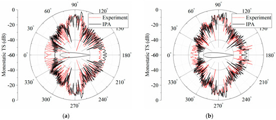 Comparison of monostatic TS between IPA and experimental measurements for a sail model at (a) 70 kHz and (b) 80 kHz. Inset: a sail model.