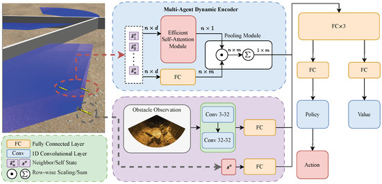 The proposed policy directly derives all state information from sensor data. Obstacle avoidance in multi-UUV systems requires both navigation through complex environments and satisfying cooperative constraints. The optimal policy also depends on each UUV’s state. Therefore, efficient encoding and transmission of this information is essential. They are described as follows.