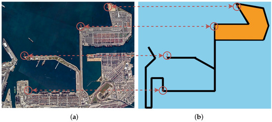 Experimental validation scenario: (a) Long Beach Port satellite imagery (Source: Google Maps), (b) simulation scenario reconstructed from (a).