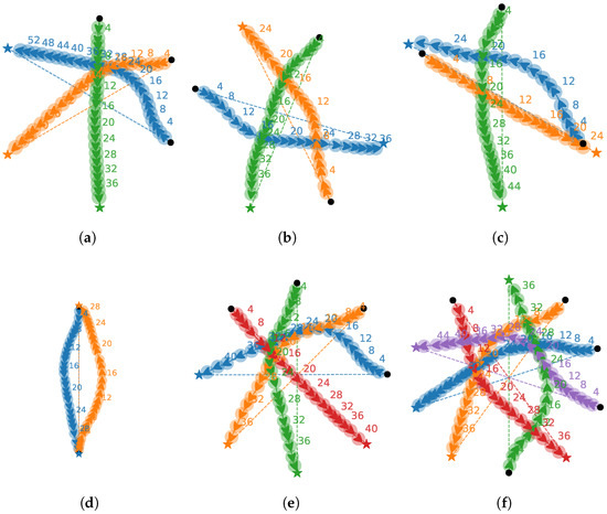 Collision avoidance trajectories within the multi-UUV system. Trajectories demonstrating collision avoidance are shown in (a–c) for 3 UUVs at random positions, with cases for 2, 4, and 5 UUVs presented in (d–f), respectively. Each color represents the trajectory of a different UUV, arrows denote the UUVs’ headings, and labels denote time.