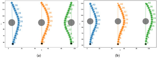 Communication distance constraint experiment trajectories. (a) shows the UUV trajectories considering the communication distance constraint, while (b) shows the trajectories without the constraint. The UUVs on both sides moved along parallel lines with a 95 m spacing, and the centers of the cylindrical obstacles lay on these lines. Different colors represent the trajectories of different UUVs.