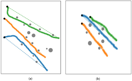 Lake experiment results under two different scenarios are shown in (a,b) at a depth of 15 m. The circles denote cylindrical virtual obstacles of varying sizes, and arrows denote the UUVs’ headings. Different colors represent the trajectories of different UUVs.