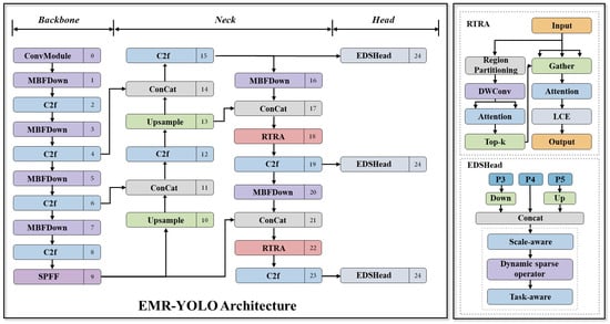 An overview of the EMR-YOLO architecture. The model adopts a standard backbone–neck–head design and integrates three key modules: MBFDown, RTRA, and EDSHead. Rightside diagrams show an overview of the RTRA and EDSHead modules.