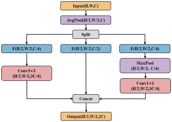 Subsequently, the feature map is divided into three parts along the channel dimension: the first part extracts local features by convolution; the second part retains the original features; and the third part enhances the key features by max-pooling and then adjusts the number of channels by convolution, which significantly reduces the computational load. Finally, the three parts of the features are concatenated along the channel dimension, resulting in an output with channels and a feature map size that is half of the input image. The calculation formula is shown in Equation (1):