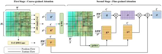 First Stage: Coarse-Grained Attention. Firstly, depth-separable convolution is applied to the feature vectors of each region to extract features, yielding the region-level query and key . By capturing spatial information on a per-channel basis and subsequently fusing channel information point-wise, the most representative feature vectors of the regions are formed, effectively reducing computational load and the number of parameters.
