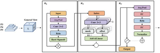 where , , and correspond to scale-aware, spatial-aware, and task-aware attention functions, which act on dimensions L, S, and C, respectively, with expressions shown in (7)–(9).