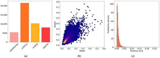Dataset: The Detecting Underwater Objects (DUO) dataset [] is selected to evaluate the effectiveness of the proposed method. To ensure the quality of the training samples, we re-annotate poorly and invalidly labeled images, and subsequently remove severely blurred or duplicate samples based on Laplacian variance (threshold ) and the Perceptual Hash algorithm (Hamming distance ). Ultimately, 5760 images are retained, representing 74% of the original dataset. This indicates that only a small fraction of the images in the new dataset are similar. The dataset comprises four types of objects, Holothurian, Echinus, Scallop, and Starfish, and is randomly split into training and testing sets in a 7:3 ratio. Figure 5 illustrates the number and distribution of instances across different scales in the dataset.