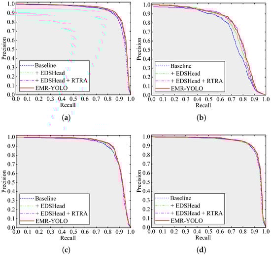 To visually demonstrate the cumulative and synergistic effects of our key modules, we select four representative configurations from Table 3 (rows 1, 2, 6, and 8) to plot their Precision–Recall (P-R) curves in Figure 6. Specifically, these four configurations are (1) Baseline, original YOLOv8; (2) Baseline + EDSHead; (3) Baseline + EDSHead + RTRA; and (4) the final EMR-YOLO model. The P-R curves clearly show that each successive addition progressively shifts the curve towards the top-right corner, indicating consistent improvements in detection performance. Notably, EMR-YOLO achieves a superior balance of precision and recall for the Echinus and Scallop categories. Although precision gains are limited for Starfish and Holothurian, the increase in recall indicates that the scheme can enhance the effective detection capability of the model.