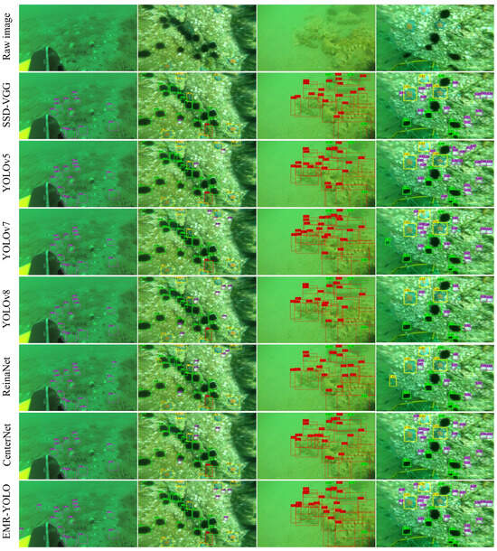 To verify the generality of the proposed EMR-YOLO scheme in real underwater environments, we selected four typical underwater scenarios for testing: background and BO confusion (the first column), motion blur (the second column), the dense distribution of BOs (the third column), and the coexistence of multi-scale BOs (the fourth column), as shown in Figure 7. The results indicate that the EMR-YOLO scheme outperforms similar methods in scenarios involving background confusion and multi-scale coexistence. Although not all BOs are correctly detected, the EMR-YOLO scheme effectively addresses the deformation problem of densely occluded targets, such as Echinus and Holothurian, due to its superior morphological and multi-scale modeling capabilities. In contrast, in the scenario of multi-scale BO coexistence, YOLOv7 achieves the highest detection precision and accuracy. This is primarily attributed to its introduction of the E-ELAN structure and label allocation strategy, which significantly enhances the feature expression capability of the deep convolutional network and improves detection performance across different scales.