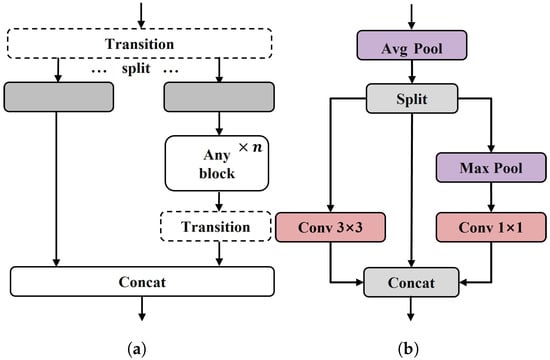 The main architecture of MBFDown draws on the design concepts of Inception [,,] and CSPNet []. Inception enhances network feature representation by extracting multiscale features in the same layer in parallel using different scale convolutions and pooling operations, but parallel computation with large convolution kernels brings high computational cost.