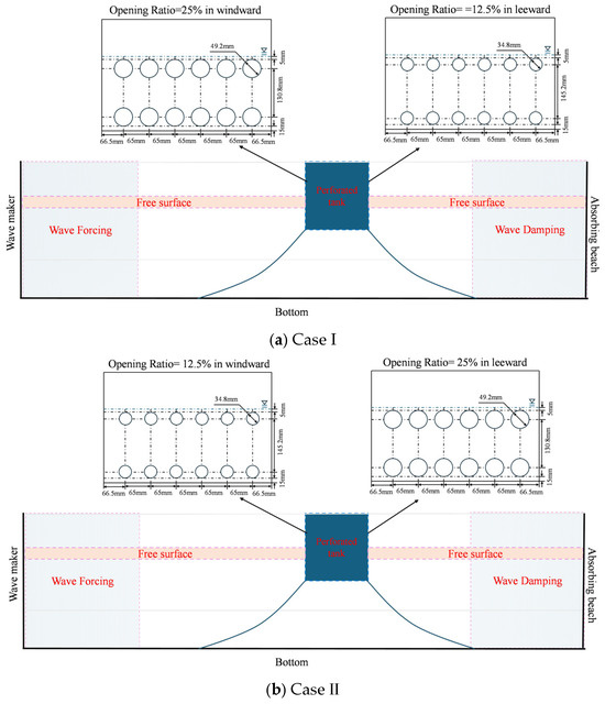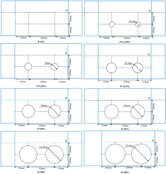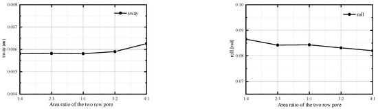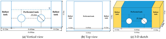 A comprehensive numerical simulation study was carried out on the tank structure with different side opening ratios (P). The motion response characteristics, especially sway, heave, and roll, were systematically examined to clarify the impact of various opening ratios on the hydrodynamic behavior of the tank. Circular openings were chosen as the standard configuration, with a fixed quantity of two perforations. Under the two opening conditions, each perforated plate had a length of 0.228 m and a width of 0.20 m, yielding a maximum achievable opening ratio of 55.8%. As a result, the parametric study covered opening ratios ranging from 0% (impermeable configuration) to 3.125%, 6.25%, 12.5%, 20%, 25%, 40%, and 50%, as shown in Table 1 and Figure 6.