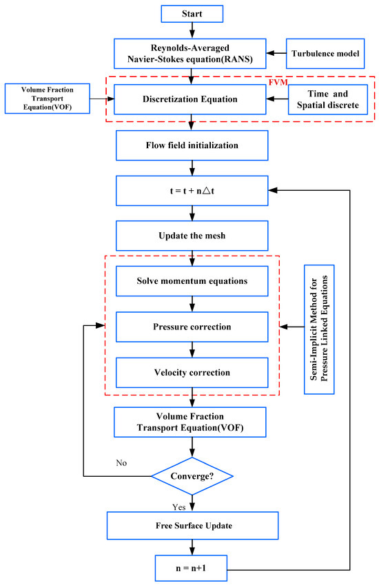 For cells adjacent to the water–air interface, the value of α ranges between 0 and 1. The gradient of α serves as a critical parameter for determining the normal direction of the interface. After obtaining the α values and their corresponding gradients for all computational cells, the approximate position of the free surface within each cell can be determined. This process enables precise surface tracking in multiphase flow simulations, facilitating a detailed analysis of the interface dynamics. Once Equations (1) and (2) were solved, α was updated based on the transport equation.
