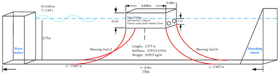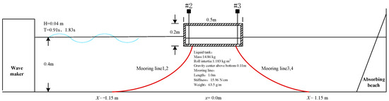 The numerical model was validated against experimental data of the interaction between the wave and the floating body with an internal liquid tank. Yu et al. [30] carried out a series of experimental studies on a floating liquid tank to study its hydrodynamic performance in two dimensions. The accuracy of the numerical results was verified by comparing the motion response of its tank and the tension of the mooring lines. The specific calculation parameters are shown in Figure 9.