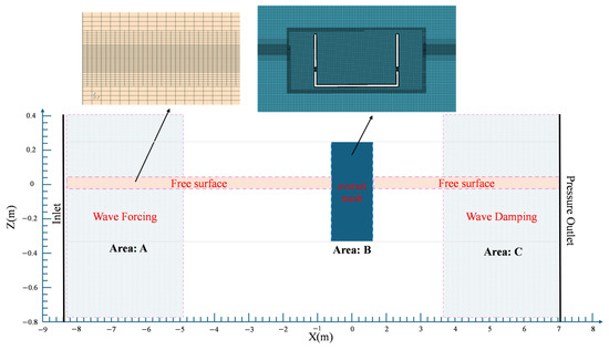 To simulate the interaction between the waves and the floating body, nested grids were used in the model with the numerical wave flume setting. Waves propagated along the positive direction of the x-axis. The background grid was mainly divided into three areas: A, B, and C (Figure 4).