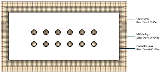 The mesh setup used a minimum Δx = L/120 and Δz = H/15 within 1.5 times the wave height to meet the requirements of wave propagation. Area B near the floating body had to be refined to meet the requirements of interpolation accuracy with the floating body grid. The overset grid was implemented to determine the floating body’s motion response under the mooring line constraints. A specialized set of refinement zones was created around the body and inside the perforated side to capture more detailed flow information. In this study, the mesh size at the perforations was locally refined, with a size of approximately dx = 0.00368 m in all cases, as shown in Figure 5. There were three layers: the outer, middle, and inner layers. They had mesh sizes of dx = 0.0105 m, 0.00526 m, and 0.00368 m, respectively.