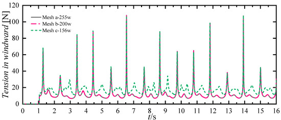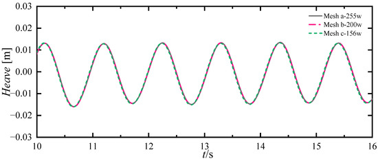 To verify the stability and convergence of the grid results, we selected Case 1 of Table 1 for mesh verification. We designed three schemes with different grid quantities, with the total grid quantities being 2.55 million (Case a), 2 million (Case b), and 1.56 million (Case c). The numerical results of the three grids, shown in Figure 7 and Figure 8, were very close and in good agreement regarding the heave motion. However, for the mooring tension in the windward, there were differences in some areas between the calculation results of the 1.56 million grid scheme and those of the 2 million grid and 2.56 million grid schemes.