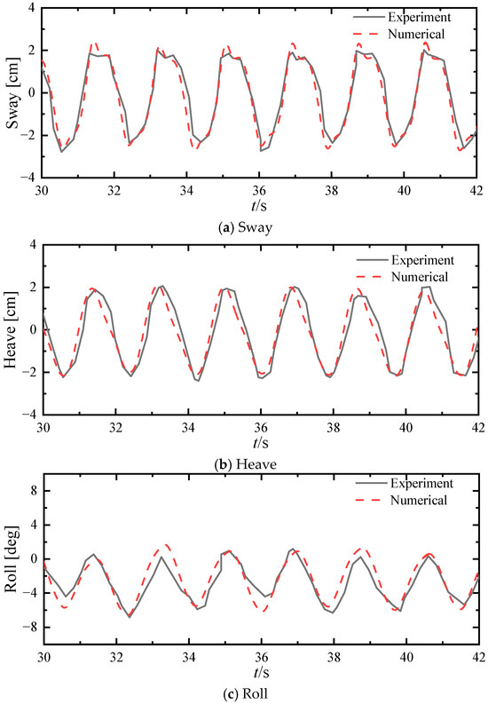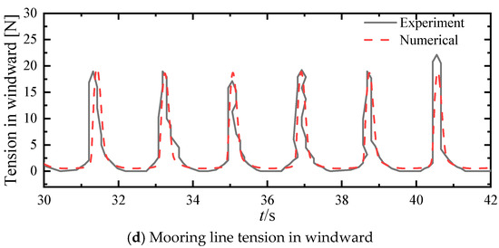 The numerical results of motion response and tension were compared with the experimental results in Figure 10, which shows the time history curves of motion responses and tension.
